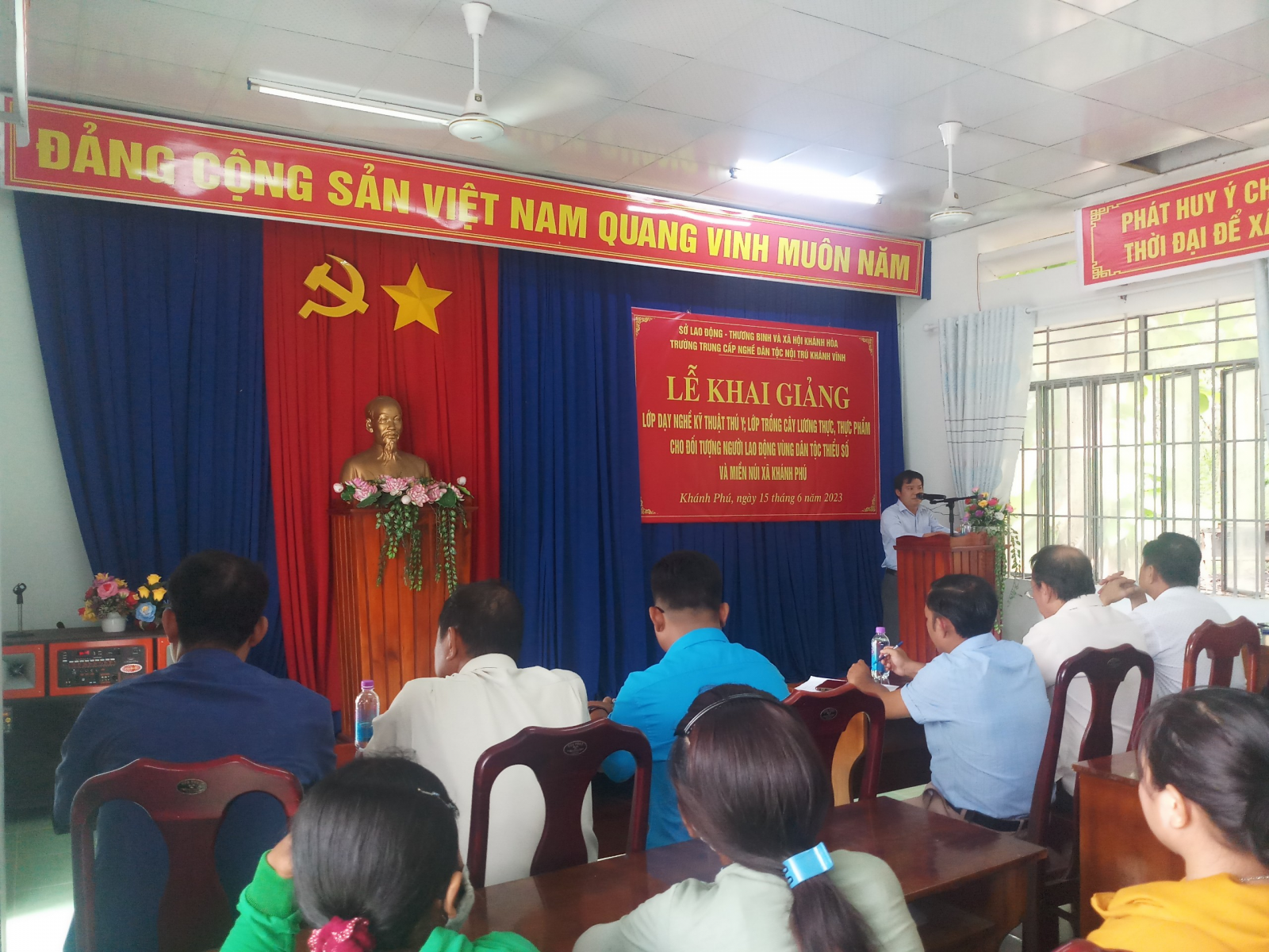 Thực hiện Kế hoạch số 3122/KH-UBND ngày 20/10/2022 của UBND huyện Khánh Vĩnh về phát triển giáo dục nghề nghiệp và giải quyết việc làm cho thanh niên vùng đồng bào Dân tộc thiểu số và miền núi huyện Khánh Vĩnh năm 2022. Chiều ngày 15/06/2023, Trường Trung cấp nghề DTNT Khánh Vĩnh đã phối hợp với Phòng Lao động - Thương binh và Xã hội huyện Khánh Vĩnh và UBND xã Khánh Phú tổ chức lớp dạy nghề Trồng cây Lương thực thực phẩm và lớp dạy nghề Kỹ thuật thú y cho đối tượng người lao động vùng dân tộc thiểu số và miền núi trên địa bàn xã Khánh Phú, huyện Khánh Vĩnh.