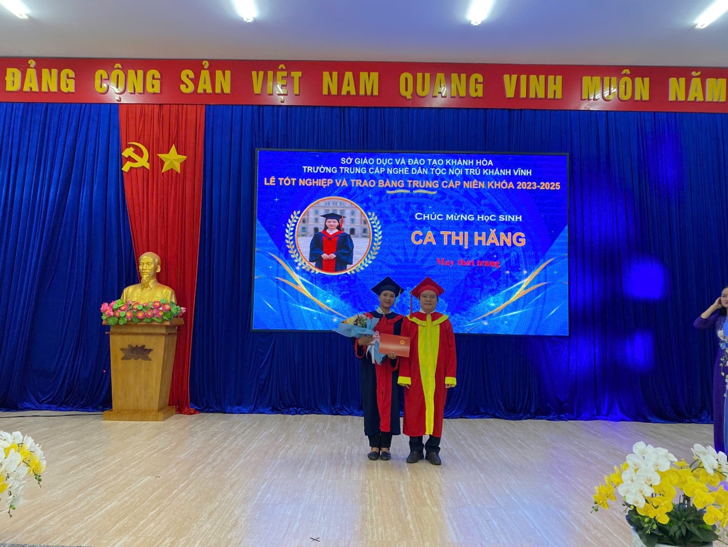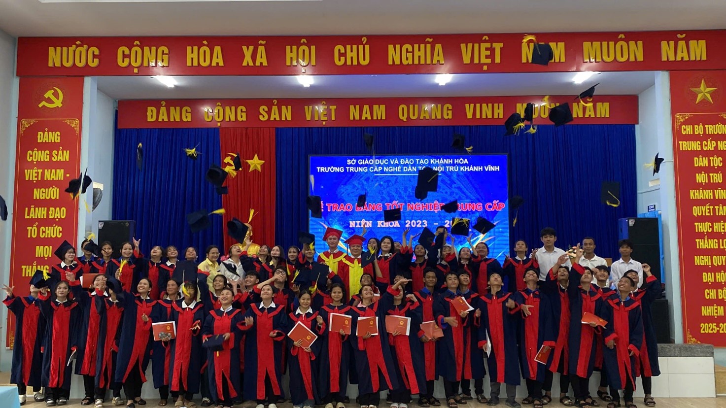 Sáng ngày 24/10/2025, Trường Trung cấp nghề Dân tộc nội trú Khánh Vĩnh đã long trọng tổ chức lễ trao bằng tốt nghiệp cho 64 học sinh. Buổi lễ diễn ra trong không khí hân hoan và tự hào, đánh dấu một bước ngoặt quan trọng trong sự nghiệp của các học sinh, đồng thời là sự kiện đầy ý nghĩa đối với nhà trường.